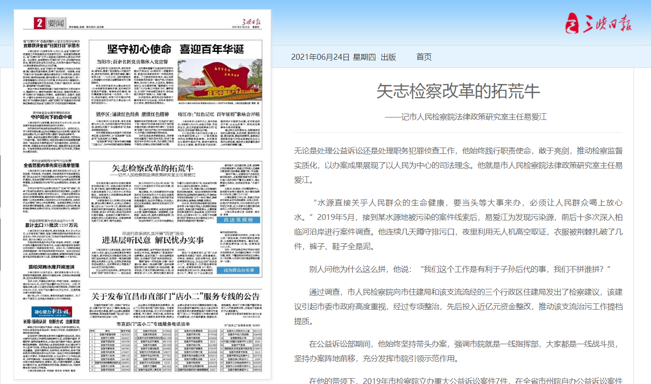 本网讯(记者李涛)6月24日,《三峡日报》二版“要闻”专版“政法英模榜”专栏,以《矢志检察改革的拓荒牛》为题,推出了记者皮亚捷、通讯员李涛采写的报道,推介了宜昌市人民检察院法律政策研究室主任易爱江的先进典型事迹。三峡广电、《三峡商报》《三峡晚报》等本市主流媒体相继进行了集中宣传,引发了社会的广泛关注和普遍好评。